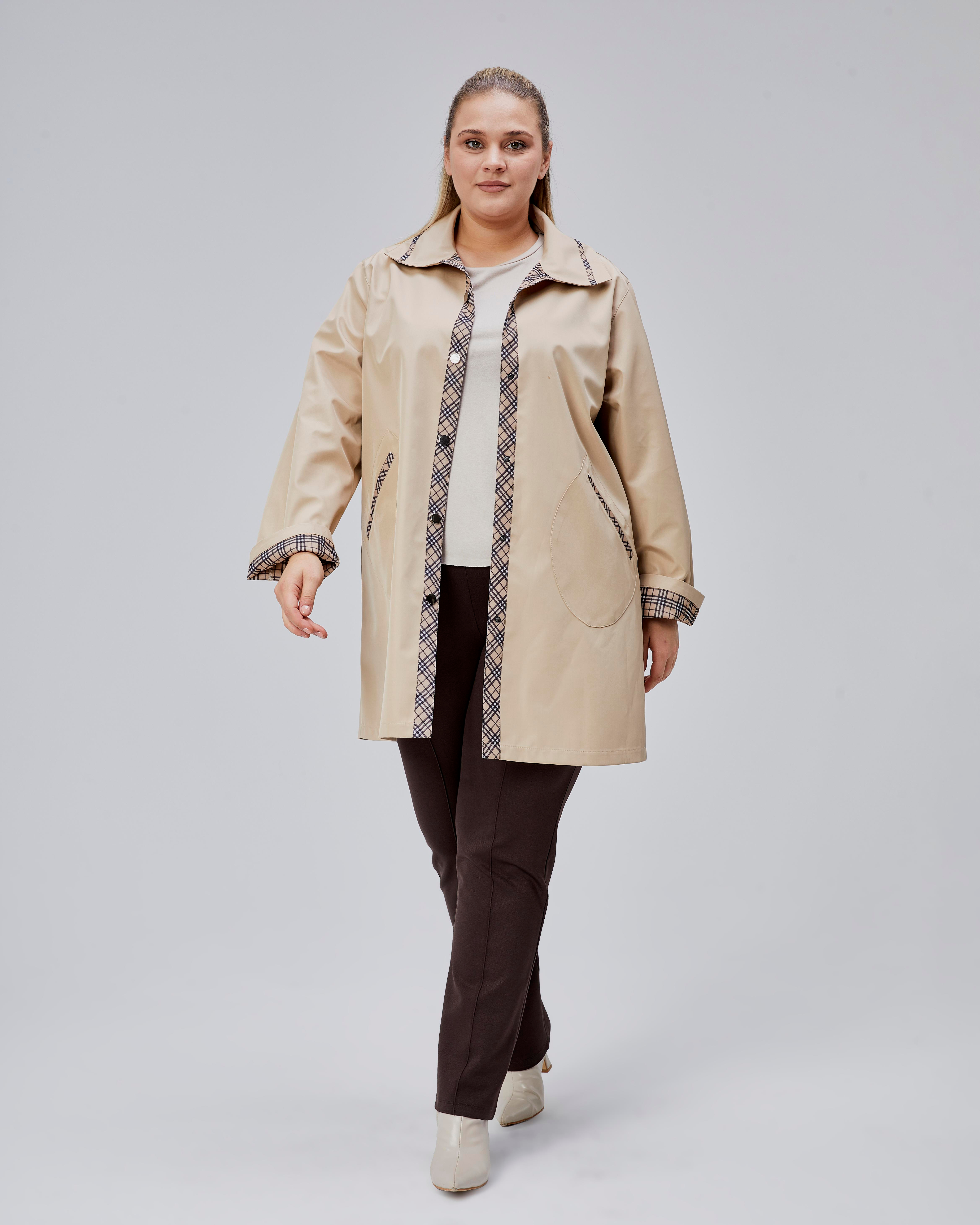 Şıklığın detaylarda gizli olduğunu kanıtlayan bu ekose desenli büyük beden trençkot, hem modern hem de zamansız tasarımıyla dikkat çekiyor. 46-66 beden aralığına uygun kesimi sayesinde konfor ve stil bir arada. İç kısmı ve kol manşetlerinde yer alan ekose detaylar ile sade görünüme canlılık katar. Kapüşonlu tasarımı, serin havalarda fonksiyonelliği artırırken, yuvarlak kesimli cepler günlük kullanımda pratiklik sağlar. Giy-çık kolaylığı sunan bu model, büyük beden kadınlar için gardırobun olmazsa olmazı olacak.