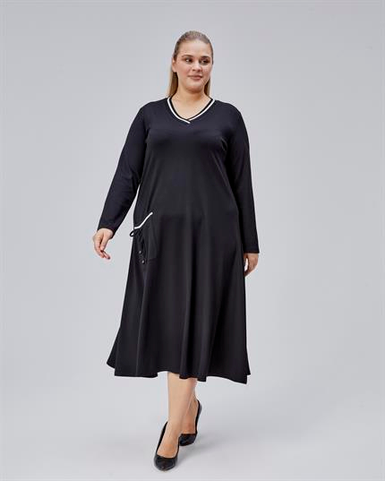 Siyah Ribana Detaylı Cepli Büyük Beden Elbise